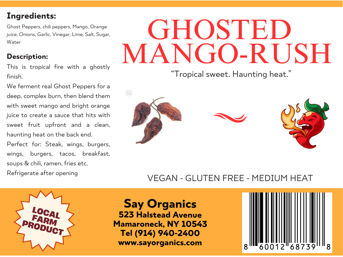 This fermented hot sauce combines the intense heat of ghost peppers with the natural sweetness of ripe mangoes. Slow fermentation develops deep, complex flavor while mellowing the sharp edges of the peppers. The result is a bold yet balanced sauce with bright fruit notes, savory depth, and a lingering, satisfying heat.